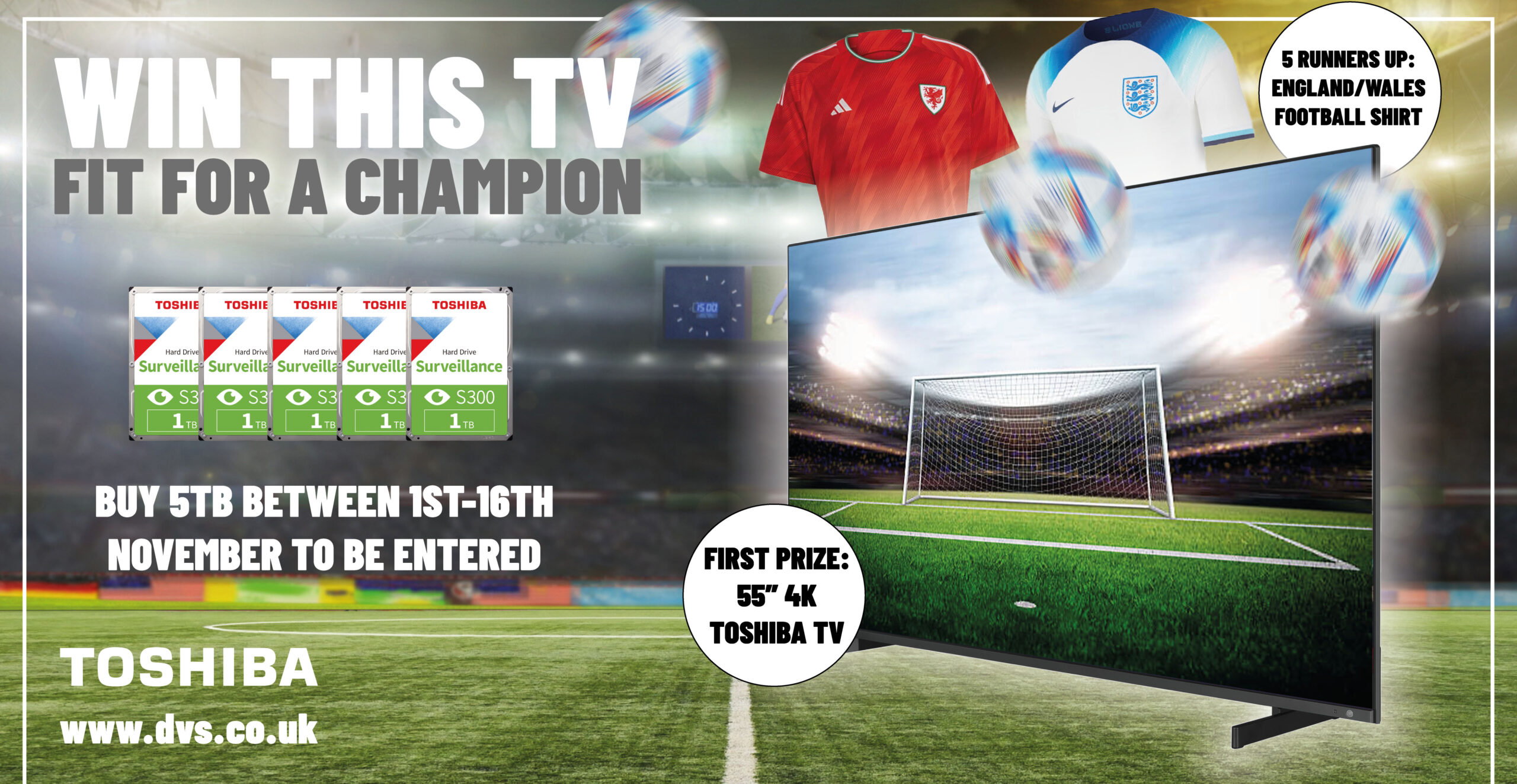 DVS are happy to announce this competition for the customers who have continually supported us over the years. This will see 1 lucky company win a 55′ Toshiba 4K TV whilst 5 runners up will win either a Wales or England home shirt to support them from Qatar (afar pun, not funny? OK.)
